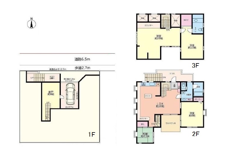 - 1階 S8畳 / 2階 LDK20畳 / 2階 和室4.5畳 / 8階 洋室8畳 / 3階 洋室 / 3階 洋室10畳