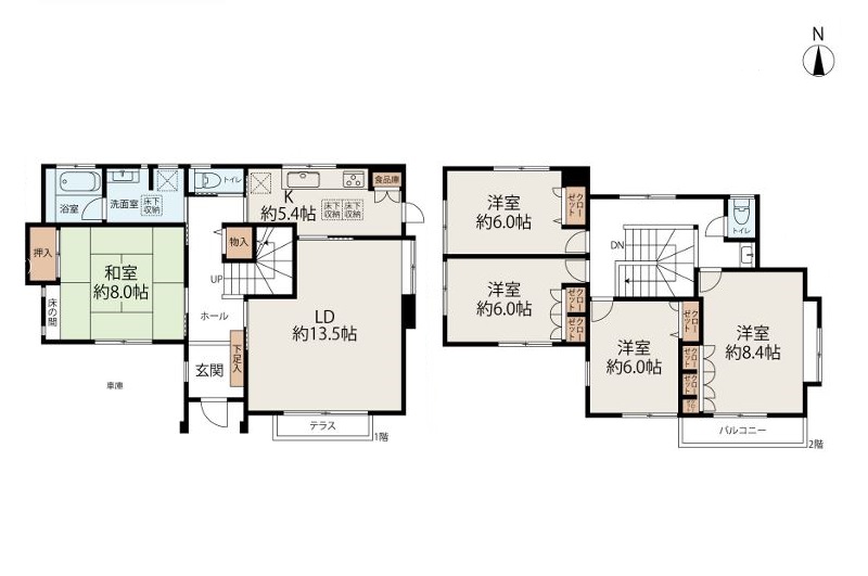 - 1階 LD13.5畳 / 1階 K5.4畳 / 1階 和室8.0畳 / 8.4階 洋室8.4畳 / 2階 洋室3畳