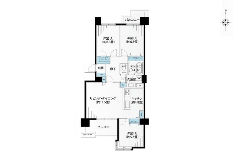 - LD11.5畳 / K4.8畳 / 洋室5.6畳 / 6.3階 洋室6.3畳