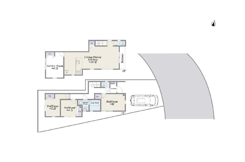 - 1階 洋室6畳 / 1階 洋室5.2畳 / 1階 洋室4.1畳 / 18.3階 LDK18.3畳 / 2階 S