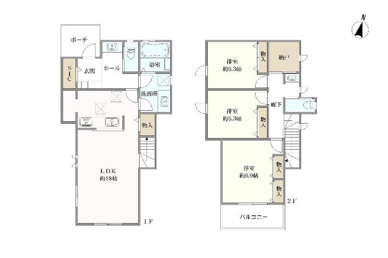 1階 LDK18.0畳 / 2階 洋室6.9畳 / 2階 洋室5.3畳