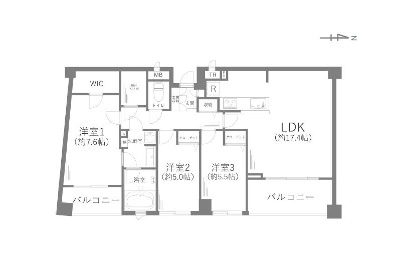 - LDK17.4畳 / 洋室7.6畳 / 洋室5.5畳 / 5階 洋室5畳
