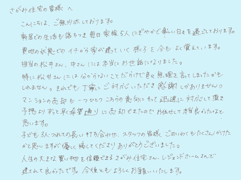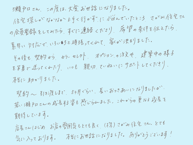 この度は満足のいく土地の紹介から契約までお力お貸しいただきありがとうございました。