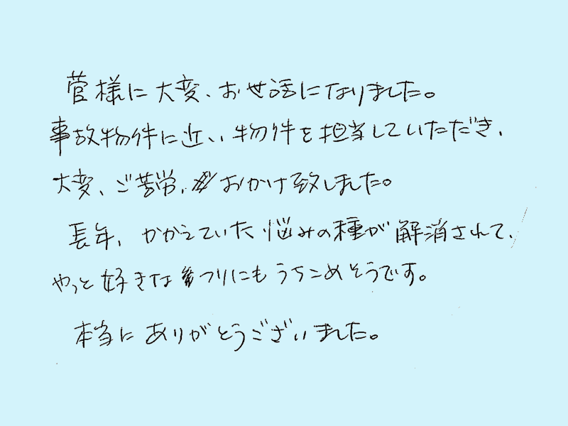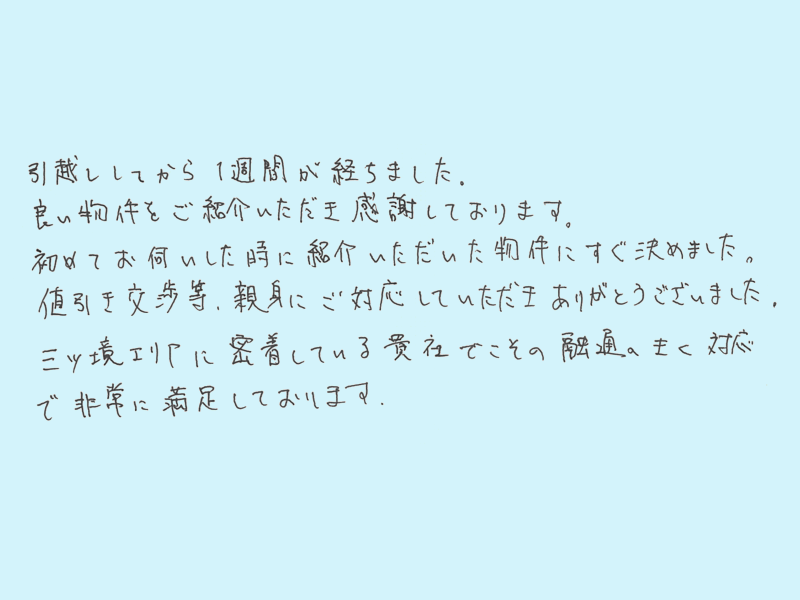 物件周辺の地域情報に詳しくお任せして間違いなかったと思っています。