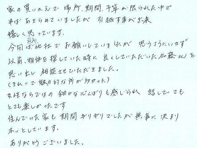 女性担当者ならではの細かな心配りが嬉しく、無事に決まりホッとしています。